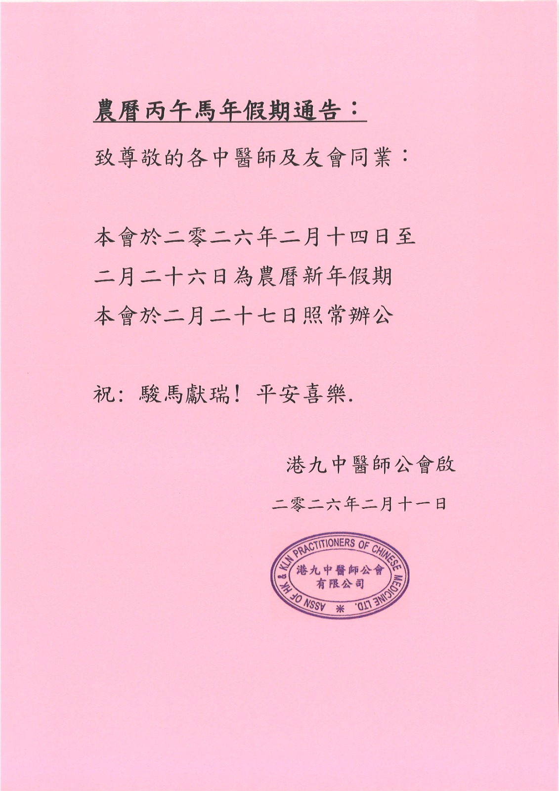 本會於2026年2月14日至26日為農曆新年假期